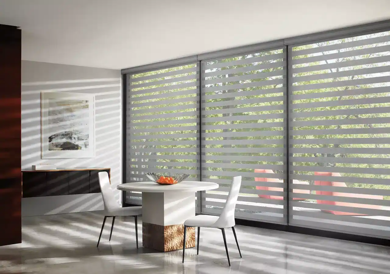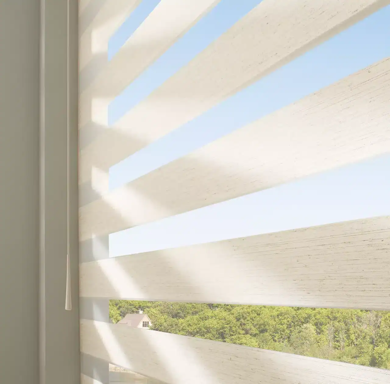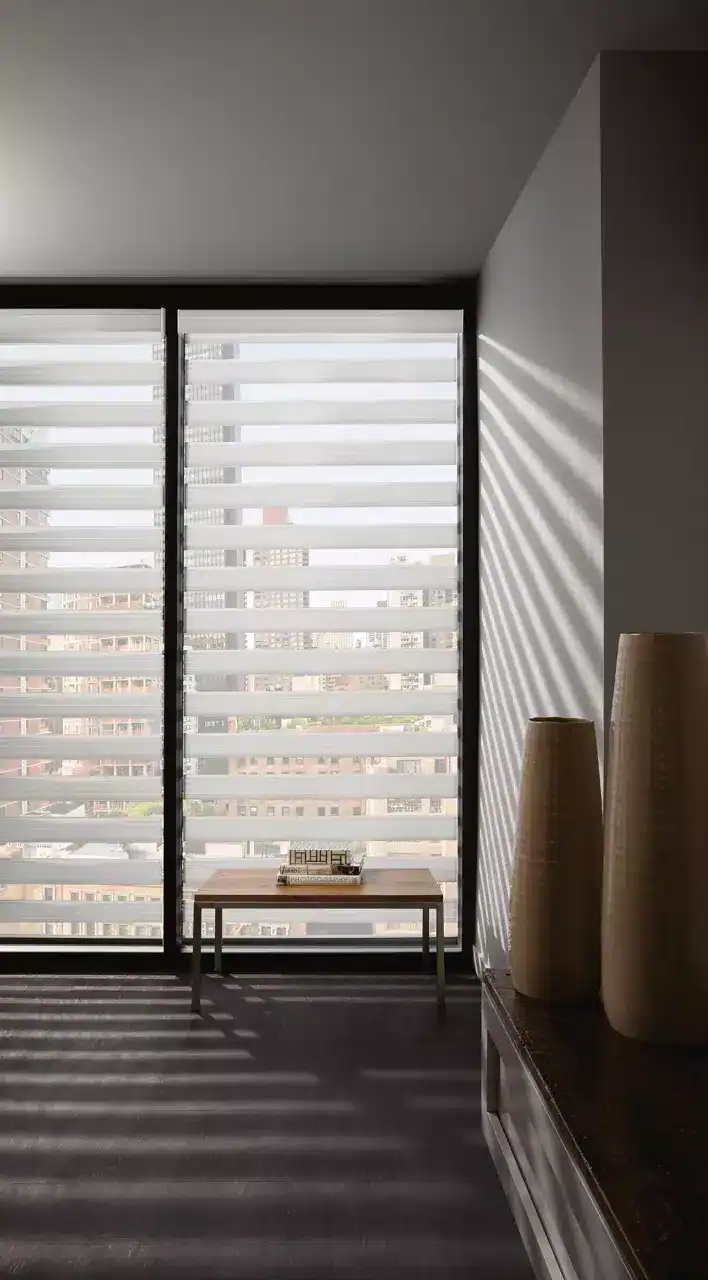Designer Banded Shades blend contemporary style with practical functionality using alternating sheer and solid fabric bands. Align the solid bands for full privacy and coverage, or offset them to let natural light in while preserving your view. This seamless shift between light and privacy creates a modern, polished look that complements both casual and formal spaces.