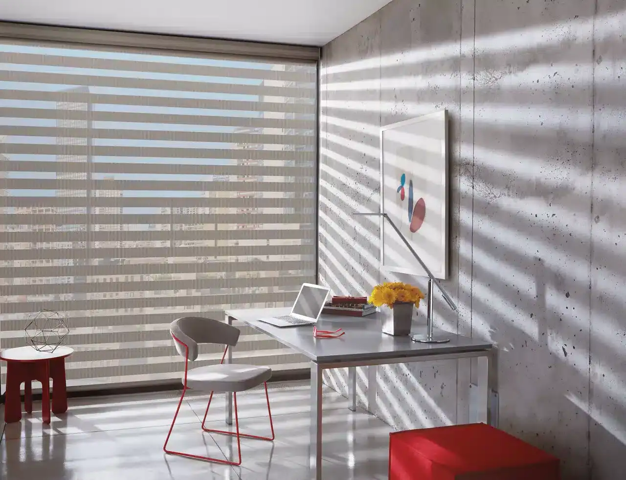 At Blinds West, we offer Designer Banded Shades in a wide range of fabrics, colors, textures, and patterns to suit any style. Customize your shades with different band heights, coordinating hardware finishes, and optional PowerView® Automation for effortless smart control. Ideal for living rooms, offices, and multipurpose spaces, Designer Banded Shades combine flexibility, style, and performance in a single, striking window treatment.
